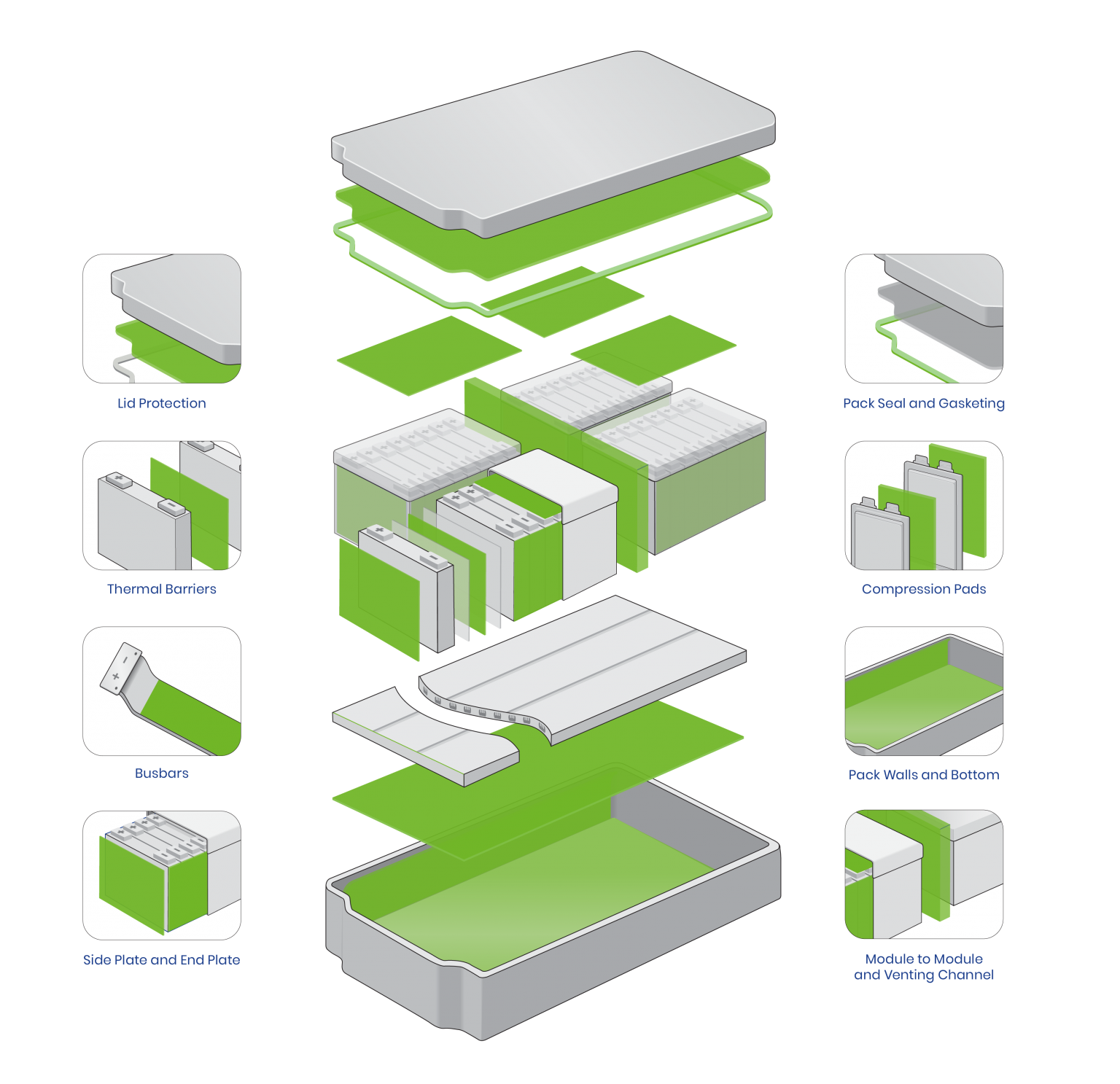 Choose from a selection of high-temperature, lightweight products to reduce thermal runaway propagation and provide mechanical, electrical, and thermal protections in the battery pack.