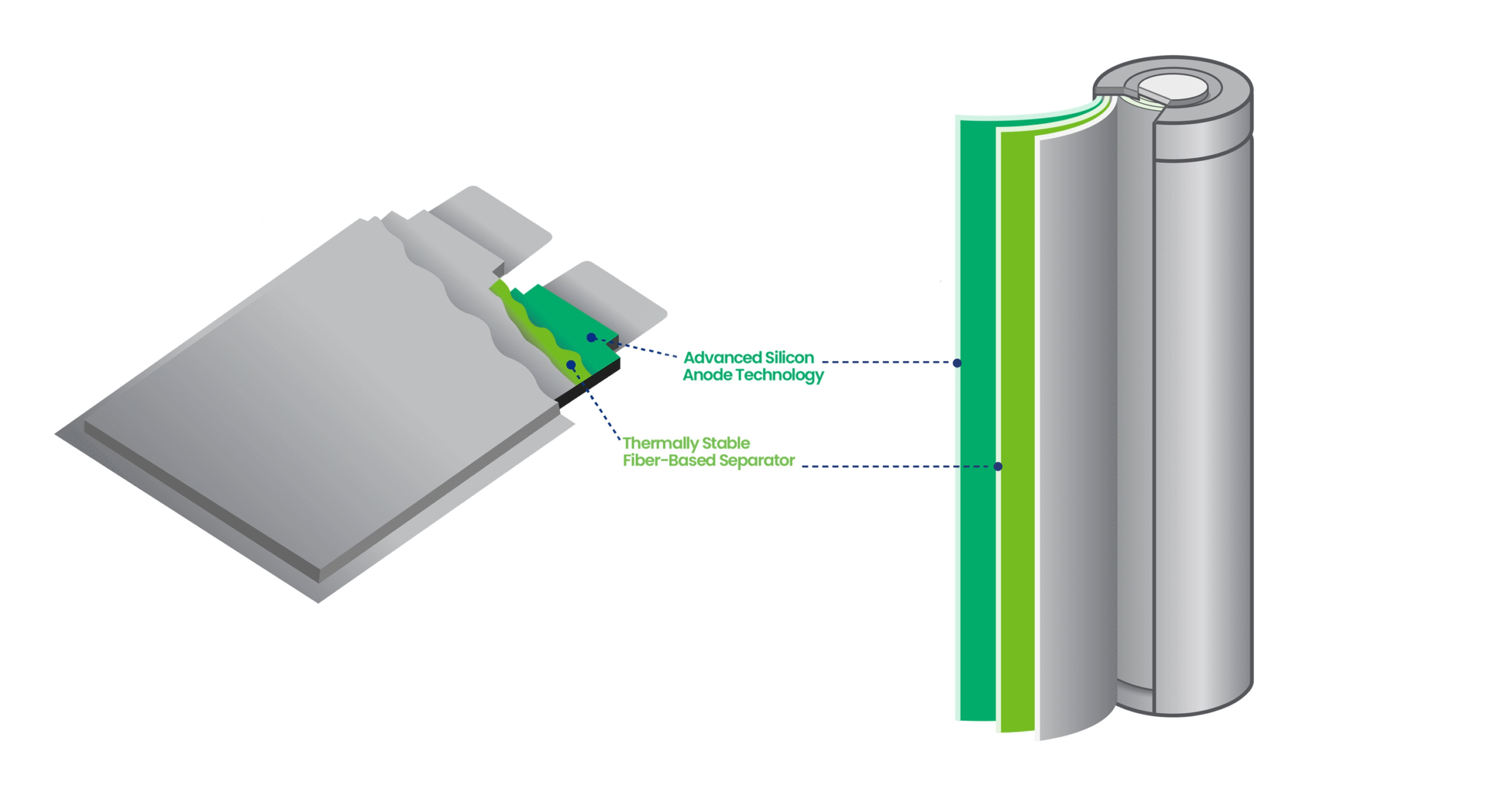 Advanced silicon fiber anode technology enables higher energy density, greater power output, faster charge time and minimal swelling.